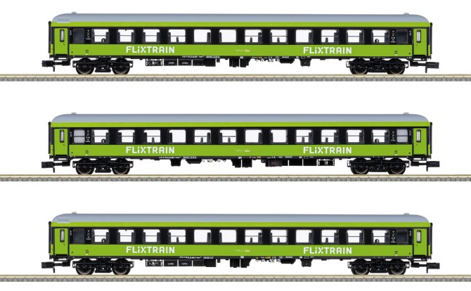 Gezogen von einer Siemens Vectron Lokomotive der Baureihe 193 von ELL rollen die grünen FLIXTRAIN Züge jetzt auch übers Spur N Gleis. Das Basis Set Art. 15462 enthält dabei 3 Wagen der 2. Klasse. Dieses Set kann mit dem einzelnen Wagen Art. 15797 beliebig oft ergänzt werden. Alle Wagen sind für den nachträglichen Einbau der Innenbeleuchtung (Art. 66616) vorbereitet. Die Lokomotive ist mit einem Digitaldecoder (DCC und mfx) und zahlreichen Licht- und Soundfunktionen ausgestattet.
